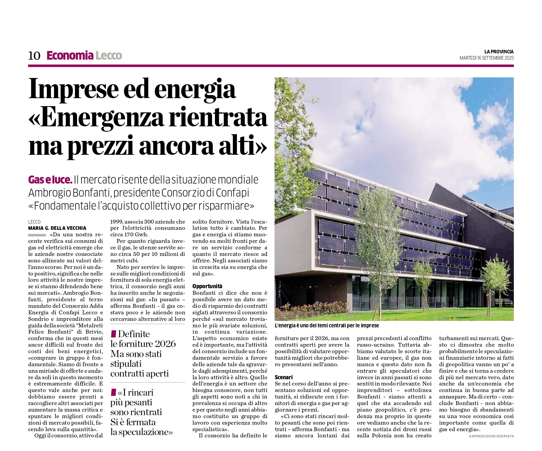 La Provincia di martedì 16 settembre, intervista a Ambrogio Bonfanti presidenza Consorzio Adda Energia.