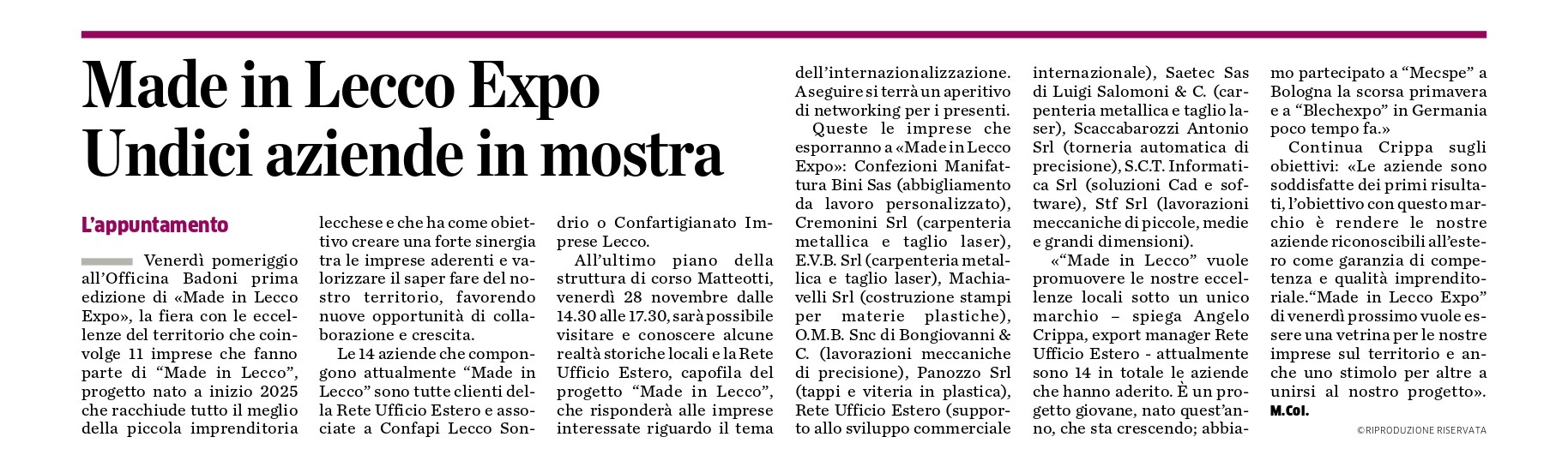 - La Provincia (in allegato): Made in Lecco Expo Undici aziende in mostra