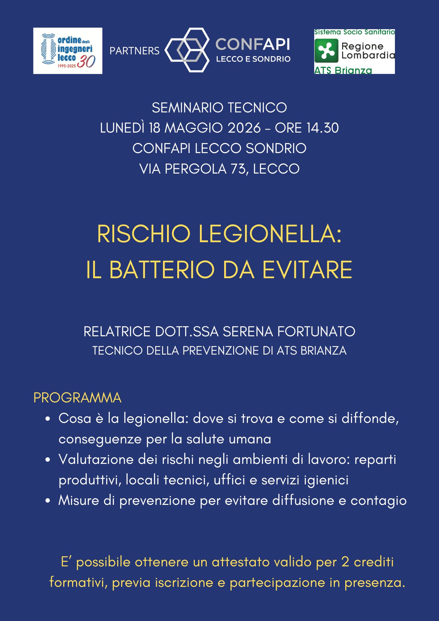 Il seminario si svolgerà lunedì 18 maggio 2026, ore 14.30 in sede Confapi Lecco Sondrio, via Pergola 73 Lecco e sarà tenuto dalla dott.ssa Serena Fortunato, tecnico della prevenzione di Ats Brianza